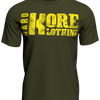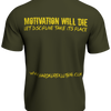 HardkoreKlothing branded olive-green t-shirt. Stylish yellow ‘Motivation will die ... let discipline take its place’ on the reverse.